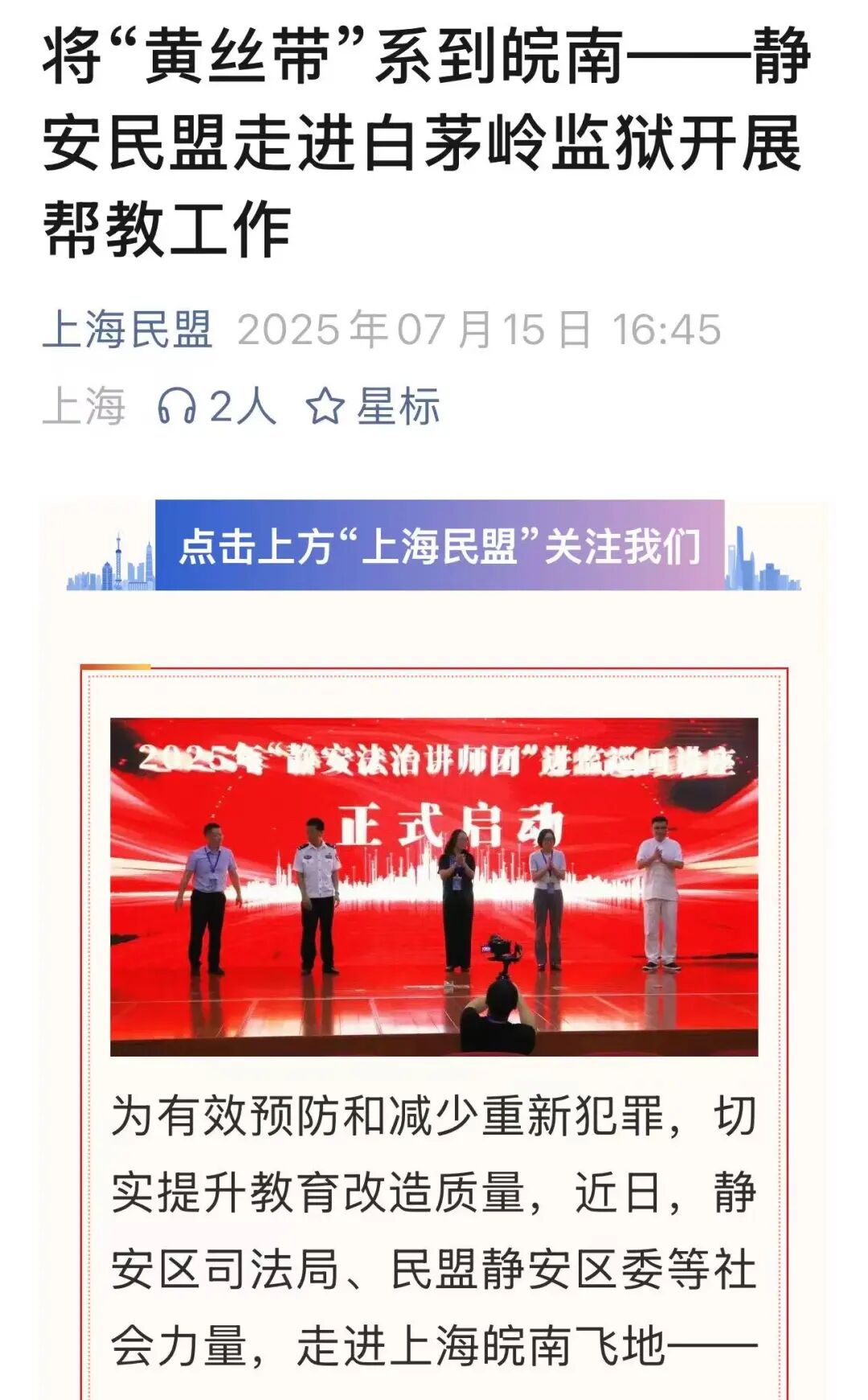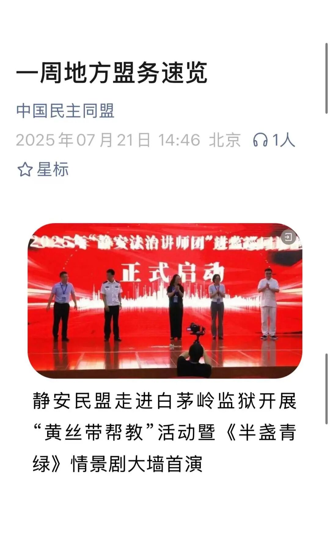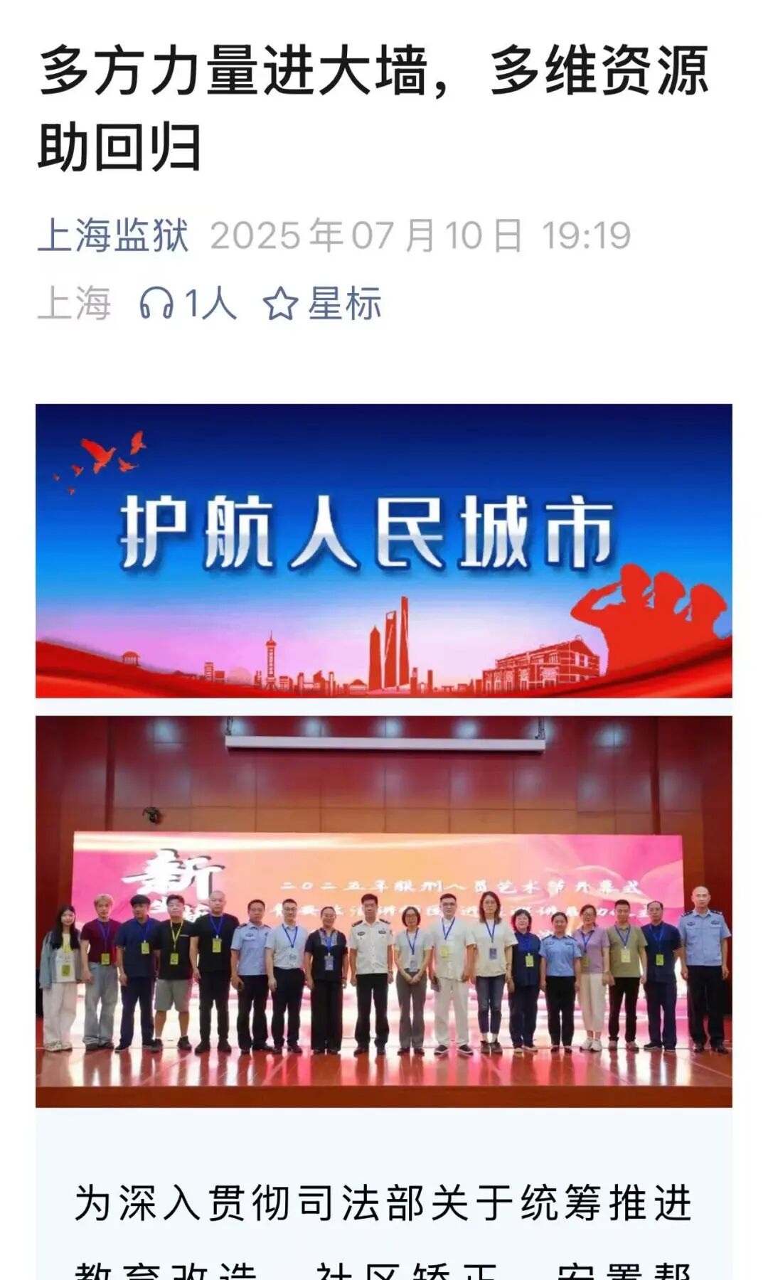 主创团队以戏文系24级戏剧教育MFA研究生为核心力量,沈伟民担任项目负责人、编剧与导演,统筹项目整体推进;24戏剧教育MFA王语晨专注于剧本改编;24戏剧教育MFA王姝雨、郭宏家、24级社会表演学MFA杨珮琪、李雅滢以及人类表演学博士生黄慧在舞台调度、演员指导等方面提供了有力支持。演出阵容除了主创团队成员,还特别邀请了上海市静安区民盟的各位成员参与,他们凭借真挚的表演为剧目大为增色。2025年7月,该剧先后在上海飞地白茅岭监狱和军天湖监狱成功上演,下半年还将继续在相关场所开展巡演。