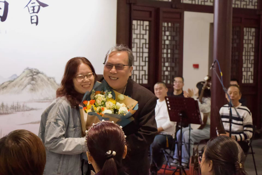 演奏结束后,曲会活动迎来了一个温情的环节。叶长海教授的博士生、东华大学教师曾双余向恩师敬赠书法作品,以此表达对叶老师六十余载躬耕讲坛、倾心育人的由衷敬意。叶长海教授桃李满天下,所培育的戏剧戏曲人才遍布全国各大高校、研究机构与院团,为中国戏剧教育事业留下了不可磨灭的印记。