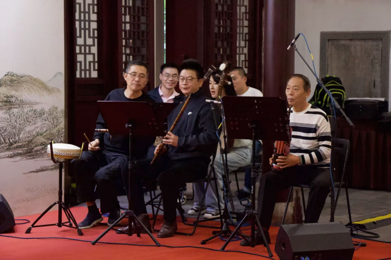 曲会伊始,曲社乐队以喜庆祥和、气韵生动的【万年欢】与【水龙吟】拉开帷幕。笛声悠扬、鼓板铿锵,中阮与提琴相映成趣,音韵交织间尽显典雅之气。