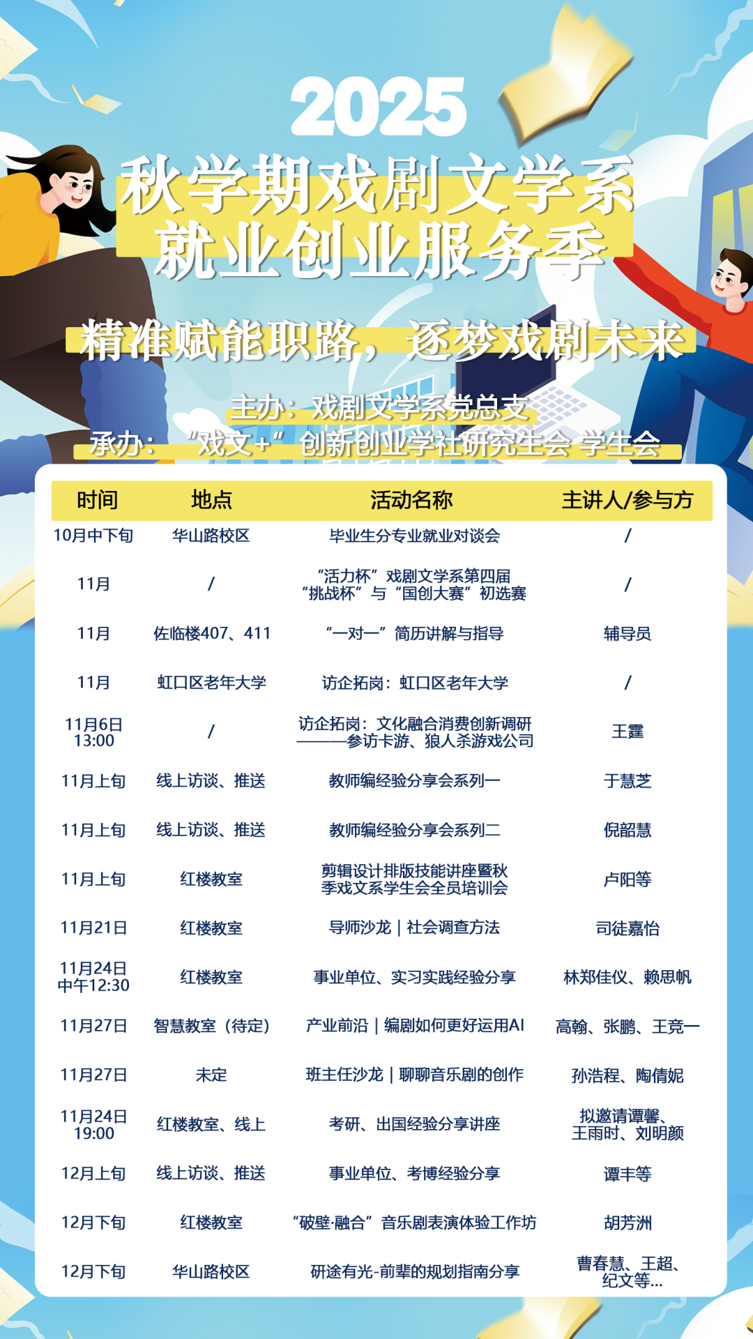 新学期如约而至,许多同学也将迎来人生的崭新阶段。就业与创业,是你们挥洒才华、追逐梦想的起点。戏文系始终心系每一位同学的成长,今年再度推出系列就业创业服务活动,持续优化支持体系,全力助大家扬帆启航!