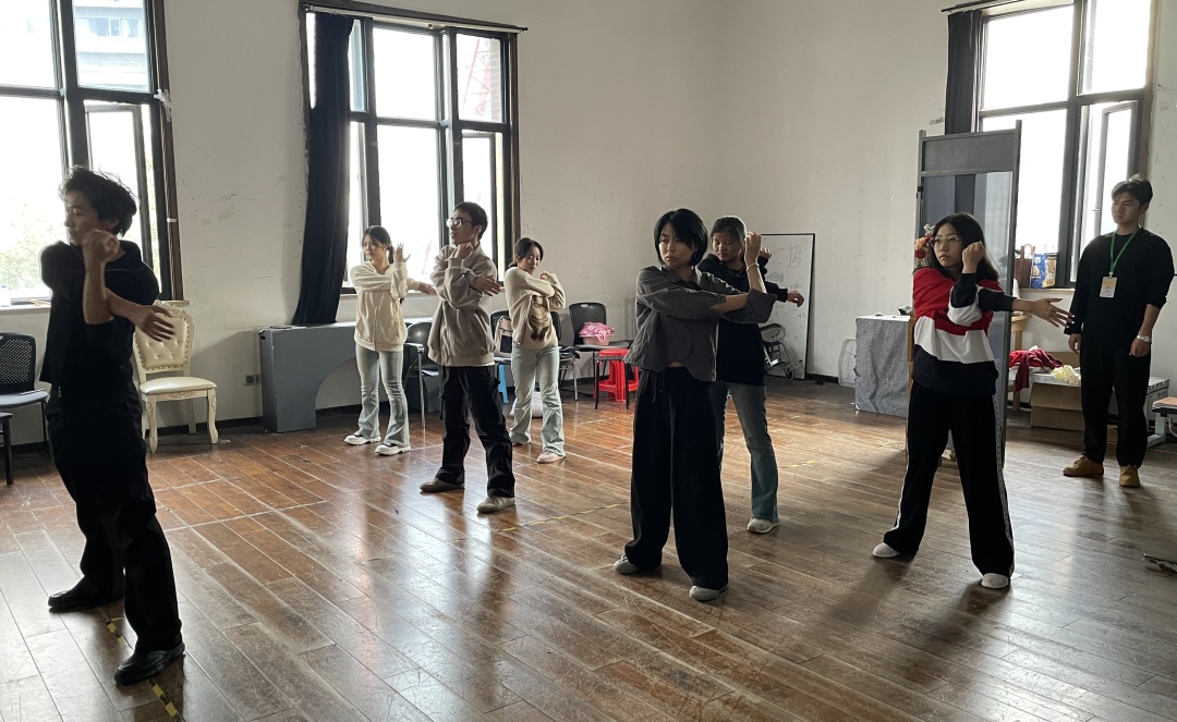 图为博物馆戏剧编剧工作坊教学,学生们在排练教室进行表演训练