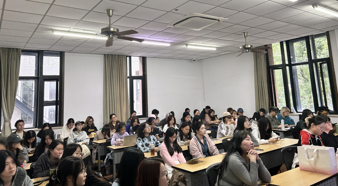 图为游戏剧编剧工作坊课堂教学,学生们听讲叠纸专题讲座