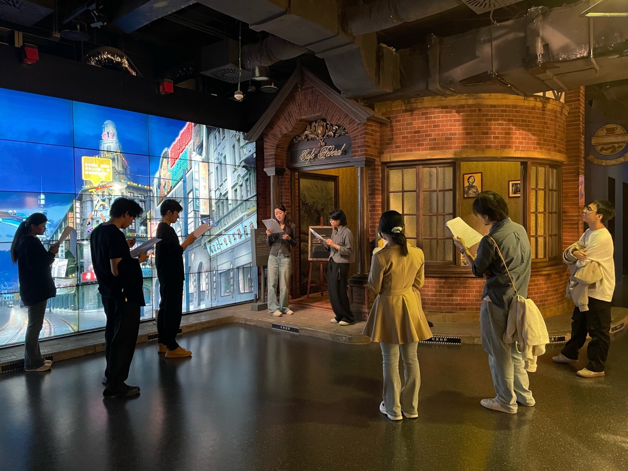 当天下午,师生一行前往上海电影博物馆进行实地排练。不同于首次参观时的实地采风,此次同学们带着完整剧本而来,从“参观者”转换为“创作者”的身份。当文字真正落地于具体空间,笔下的剧本开始经受现实的检验,展厅的实际空间、展品的陈列位置、观众的行进动线都对剧本提出了新的要求。大家结合展陈空间的布局特点分组排练,重点就场景转换衔接、角色与展区的适配度、观众视角的引导等问题展开实地打磨,在真实空间中不断调整和完善剧本。