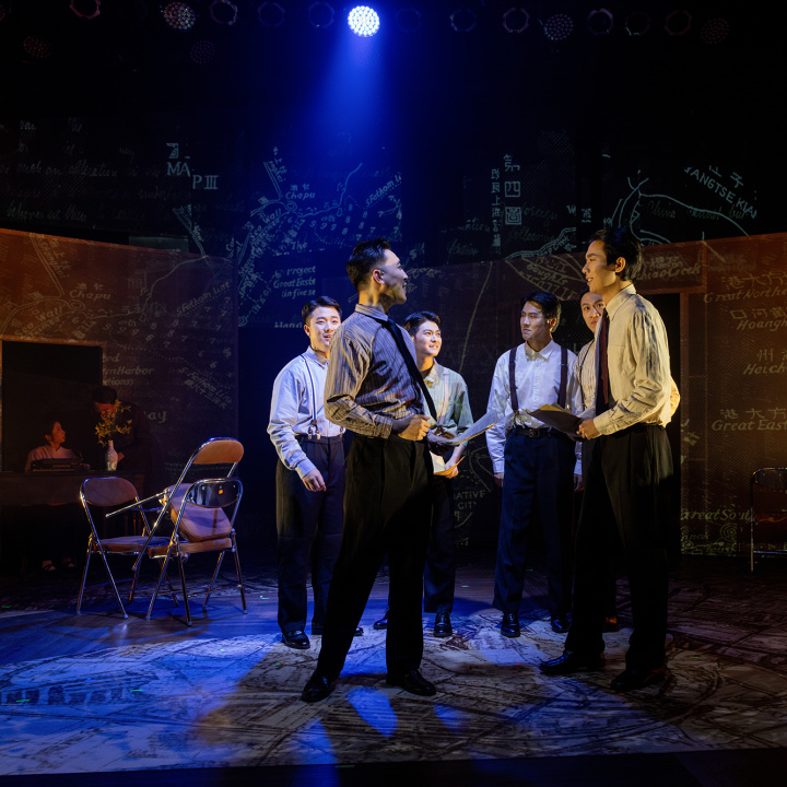 在这个家里,孙中山写下了著名的《实业计划》,此书后来与《孙文学说》《民权初步》共同构成了《建国方略》。今天看来,孙中山先生在《实业计划》中提出的关于铁路、港口、大坝的建设方案仍然具有极为超前的战略眼光。在表现《实业计划》的写作时,舞台以多媒体在地上投影大幅地图,演员们借助折叠椅的变换通过节奏紧凑、张力十足的肢体语汇,对《实业计划》所描述的内容进行了艺术化的表达,使观众直观地感受到伟人对于中国的未来所作出的富于远见的规划。